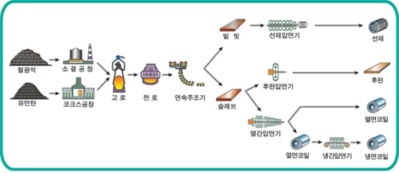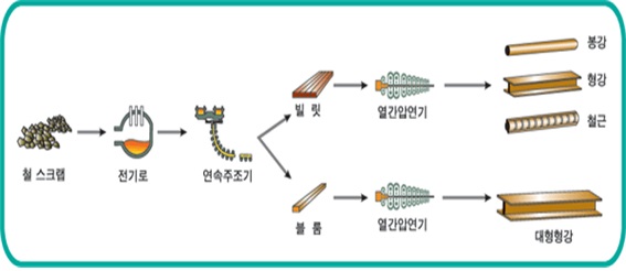 8. 철강제품을 생산하는 방법은? 강재의 생산방법은 크게 일관제철공정과 전기로공정으로 나눌 수 있다. 일관제철공정은 철광석과 원료탄 (원료탄 : 원료로 사용되는 석탄이라는 의미이나, 사용량이 압도적으로 많은 코크스용 원료로서의 석탄(유연탄)을 말하는 경우가 많음)을 주원료로 고로에 투입하여 용선 (용선 : 용융상태의 금속, 특히 선철을 말함) 을 생산하는 제선 (제선 : 철광석을 녹여 선철을 만드는 것) 공정, 불순물을 제거하는 제강 (제강 : 철로부터 불순물을 제거하고 성분을 조정하여 강을 만드는 공정) 공정, 연속주조방식에 따라 슬래브, 빌릿 등 반제품을 생산하는 압연 (압연 : 회전하는 압연기의 롤 사이에 가열한 쇠붙이를 넣어 막대기 모양이나 판 모양으로 만드는 공정) 공정으로 나뉜다. 일관제철공정에서는 용선의 대량공급이 가능한 고로공정이 꼭 필요하기 때문에 초기 설비투자에 많은 비용이 들어가며 전기로에 비해 생산 탄력성이 낮다. 그러나 원료의 높은 청정도와 고탈탄 능력으로 인하여 표면특성과 가공성이 중시되는 판재류 (판재류 : 슬래브를 재가열 및 압연하여 plate 형태로 만든 철판) 생산에 유리하다. <일관제철 공정> ![]() 전기로공정은 유연탄과 철광석 대신 철스크랩 (철스크랩 : 쇠부스러기나 파쇠, 고철을 뜻함)을 원료로 쇳물 대신 전기를 사용해 철강제품을 생산하는 방식이다. 전기로의 종류는 전극에 전류를 통과시킴으로써 고철 사이에서 발생하는 아크열로 산화정련하는 아크로와, 도가니 주위에 감은 코일에 전류를 통과시킴으로써 유도전류에 의한 저항열을 이용하는 유도로가 있다. 전기로에서 용융된 철스크랩은 불순물을 제거하는 정련공정을 거친 후 빌릿, 블룸 등 반제품 소재와 형강, 철근, 선재, 열연강판 등 기초 철강소재를 생산한다. 전기로공정에서는 정련과정을 통해 철스크랩에 포함된 Cu, Sn과 같은 잔류원소의 완전한 제거가 불가능하여 합금강이나 강도중심의 형강, 철근 등 조강류 (조강류 : 형강, 봉강, 철근, 선재 궤조 등을 말함)를 주로 생산한다. <전기로 공정> ![]() ※ 해당 자료에 대한 조언이나 문의는 기술환경실 신승준 계장(02-559-3576, seungjun.shin@ekosa.or.kr)에게 연락바랍니다. |
